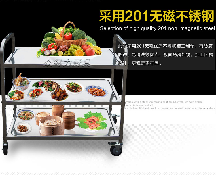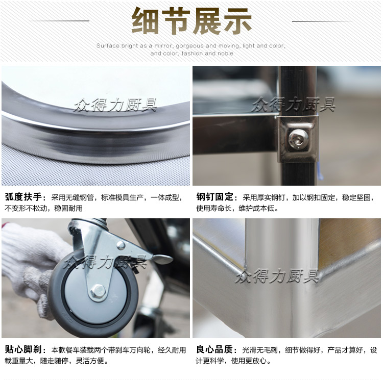 江西眾得力廚具有限公司生產銷售商用廚具,食品機械,提供中央廚房工程項目整體解決方案。不銹鋼餐車有大號、中號、小號,本公司生產銷售的不銹鋼餐車系列均采用201無磁不銹鋼材質,板材厚度足0.8mm,整機拆裝方便,結構牢固,承重能力強。