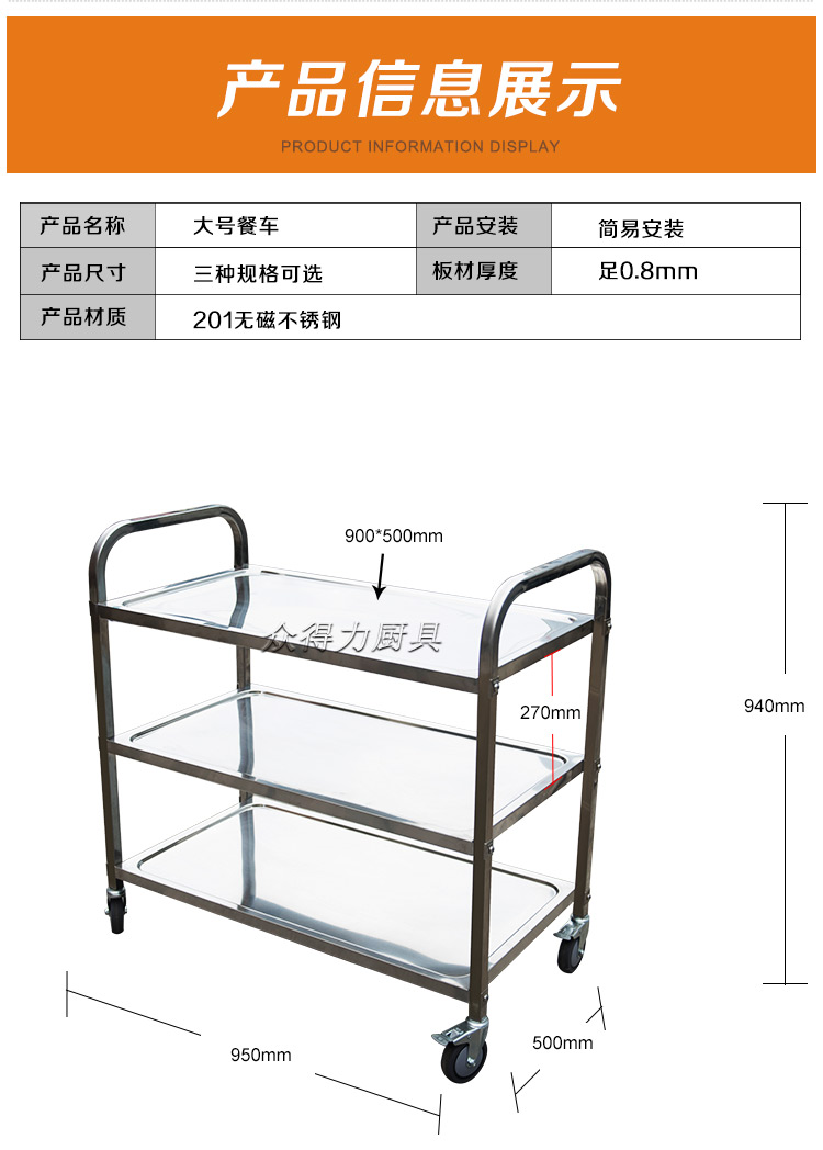 眾得力不銹鋼餐車系列價格及尺寸: